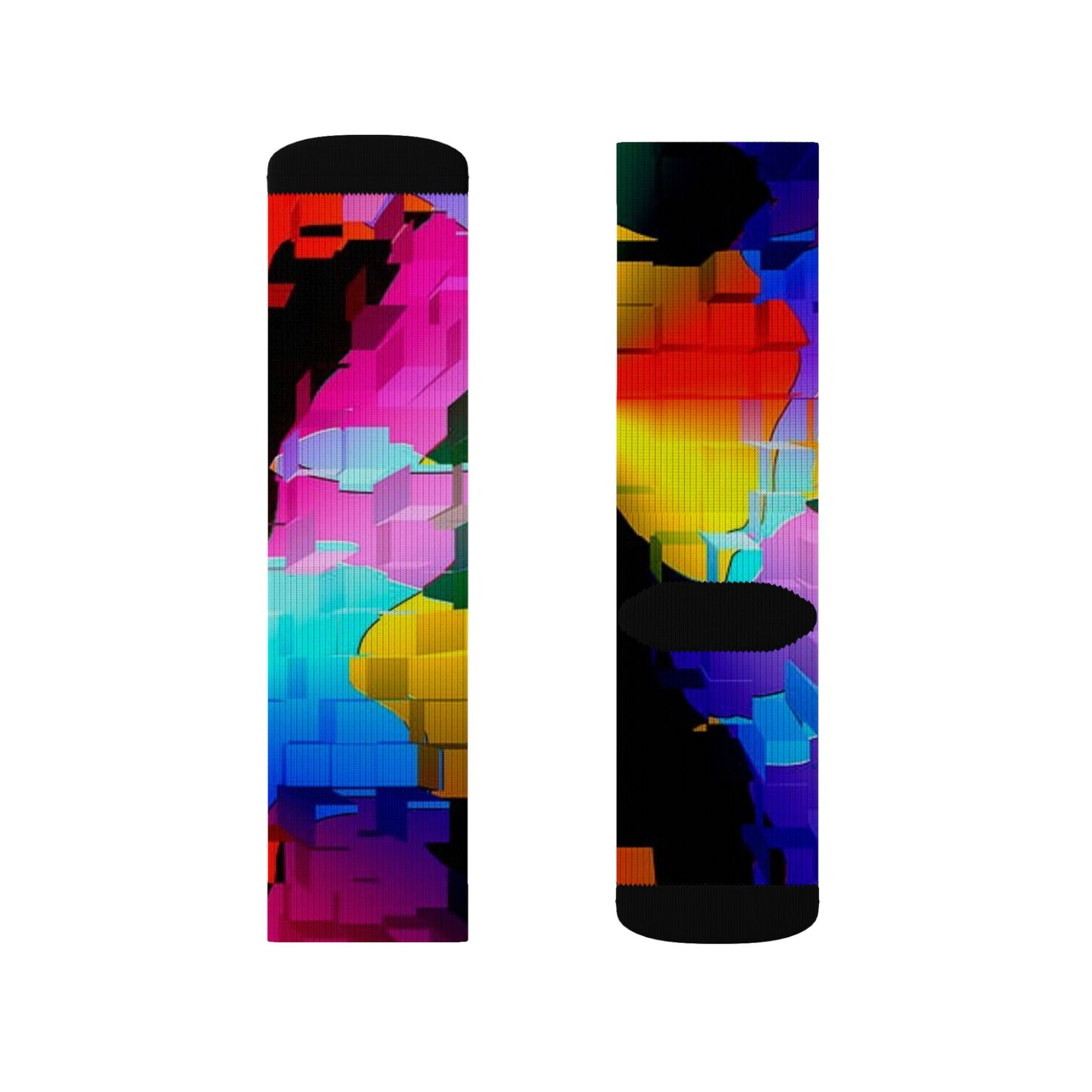 These crew-length sublimation socks bring bold color and cozy warmth to everyday wear. Plush fleece lines the bottom for soft comfort while cushioned soles reduce impact on long days. The all-over print wraps the sock in a vivid, abstract mosaic of saturated hues—each step becomes a bright, energetic accent to your outfit. The ribbed tube and regular unisex fit keep the sock secure without squeezing, and three size options make it easy to find the right fit. Note the flat sublimation printing may show slight color variation at side seams, which adds to their handcrafted look.